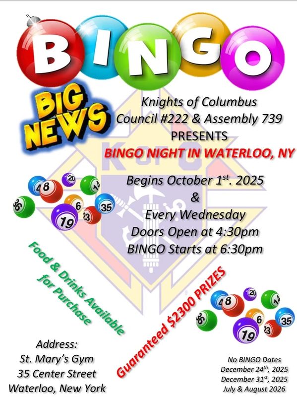 2nd Tuesday of each month at 7pm in the St. Mary's Church Conference Hall Classroom 35 Center St. Waterloo, NY